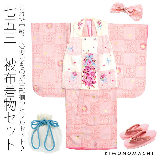 →肩上げ、腰あげ加工【商品内容】被布コート・着物・長襦袢・草履・伊達衿・巾着・髪飾りの計7点セットです。