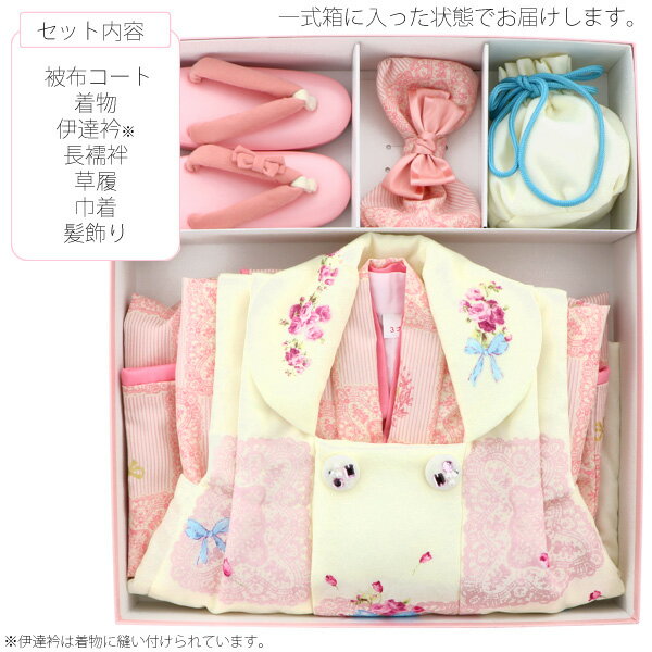メゾピアノブランドの被布コート・着物・長襦袢・伊達衿・草履・巾着・髪飾りの計7点セットです。