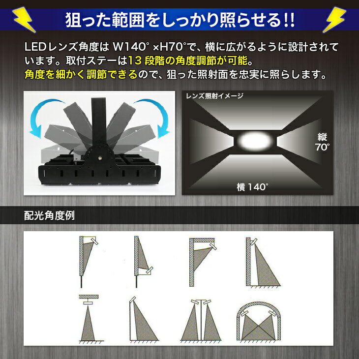 使用温度範囲:−20℃〜50℃ 力率:>95% 材質:本体:アルミダイキャスト 表面カバー:PC樹脂 特長 ・LEDを採用した省エネタイプの高出力投光器です。